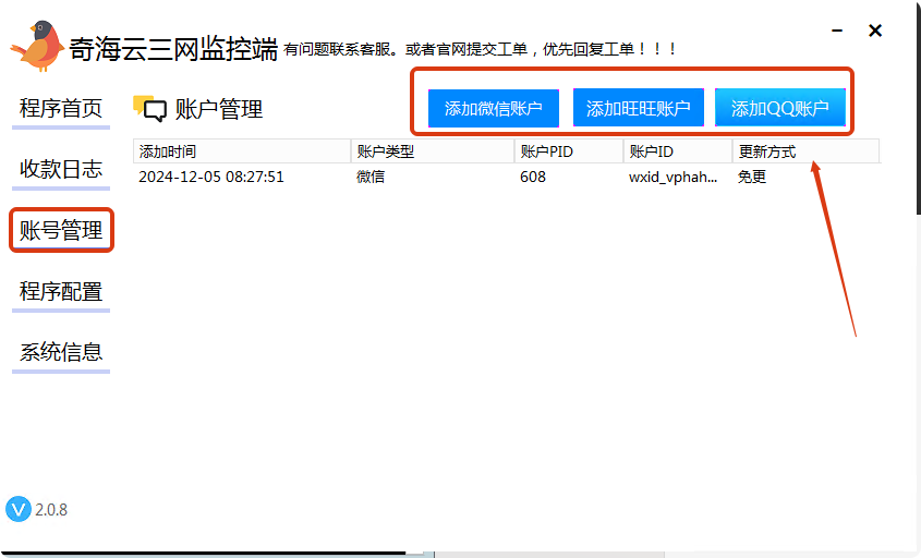需要下载监控指定版本的QQ,微信或者支付宝,否则会导致无法读取,下载正确则选择进行或者账号进行监控即可。