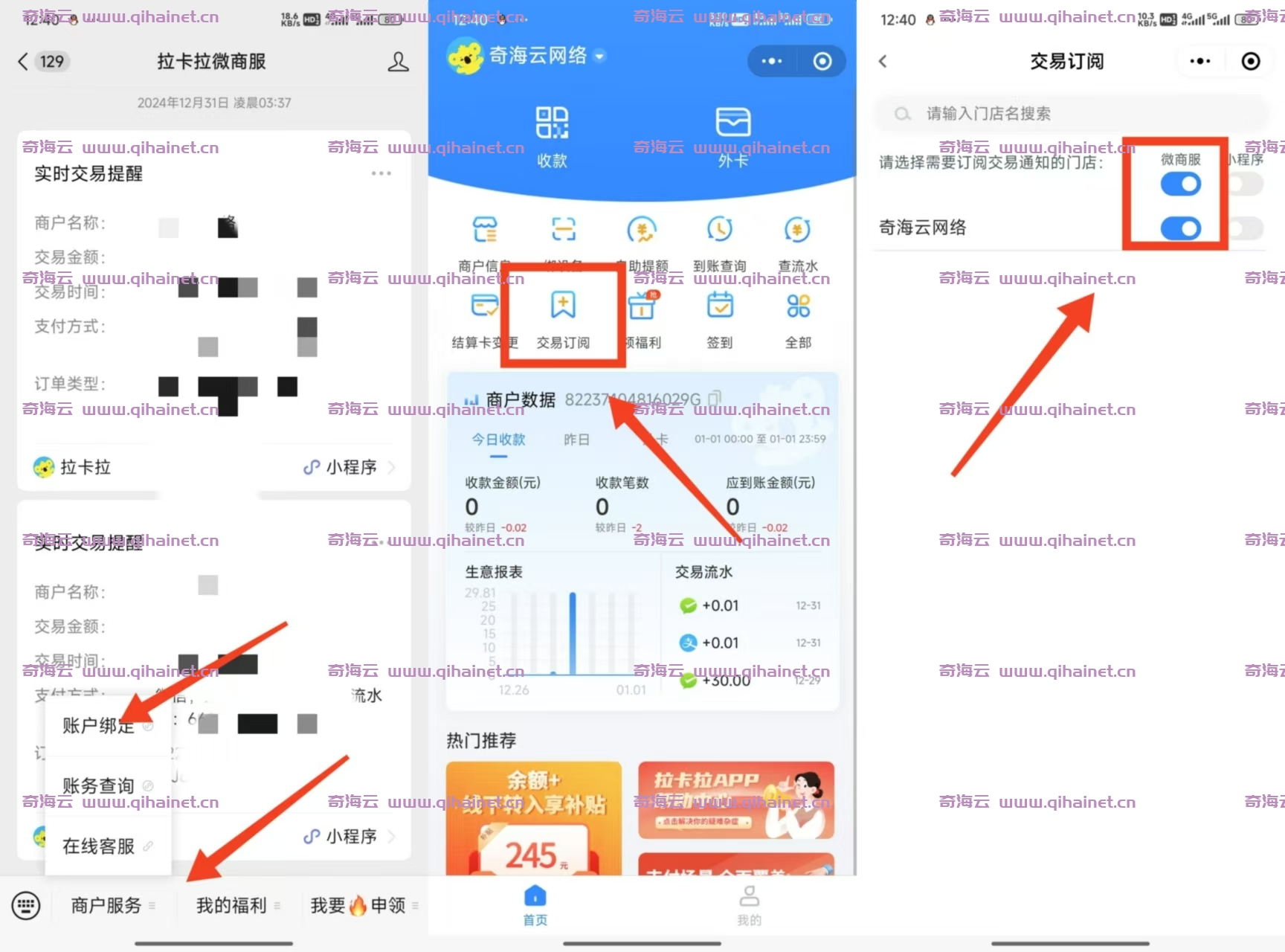 点击下方菜单商户服务–绑定账户,进入小程序,登录你的拉卡拉商户,要在你挂监控的微信上登录,别2B登其他号了。 点首页的交易订阅,选择你要收款的店铺,微商服那一栏打开。