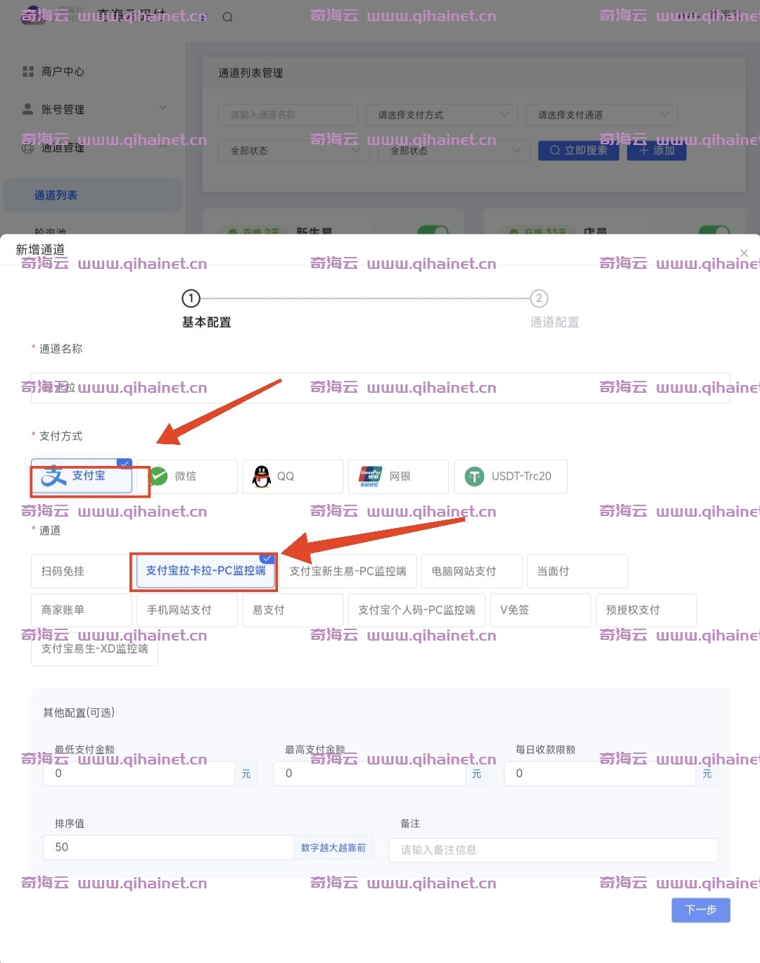 - 进入商户端添加通道,拉卡拉支持支付宝和微信,添加方式一样看图