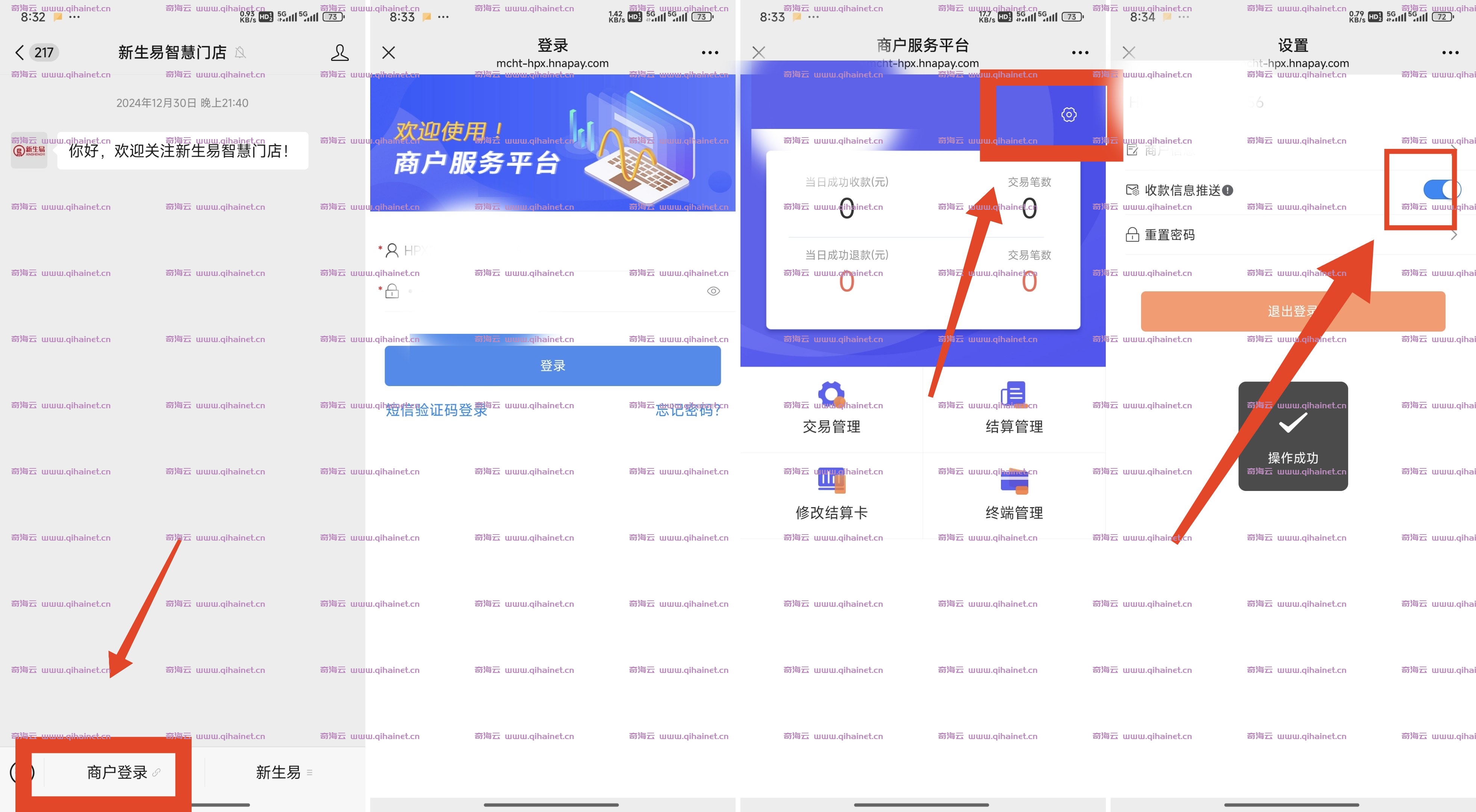 好了之后,微信绑定商户,开启通知,微信关注【新生易智慧门店】公众号,绑定新生易商户号,开启通知。